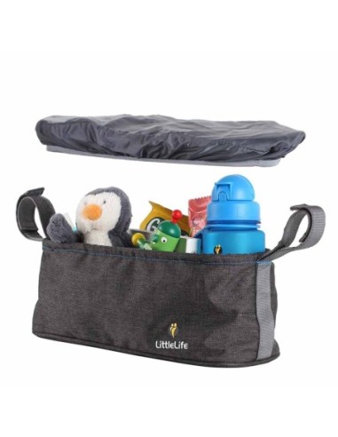 Si aggancia facilmente a qualsiasi passeggino o carrozzina con cinghie e ganci e dispone di due portabevande incorporati per tazze o bottiglie, due tasche a scorrimento e una tasca in rete con cerniera.