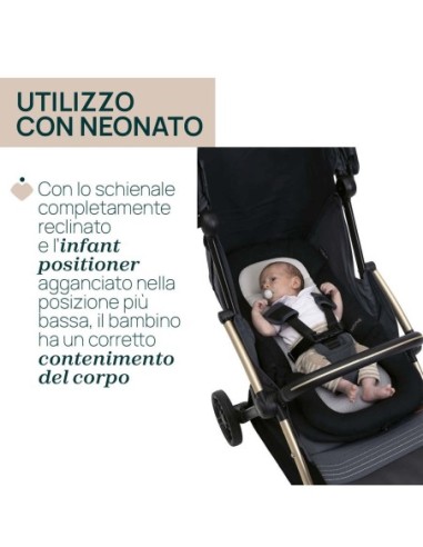E' dotato di un infant positioner ovvero un cuscino regolabile che aiuta il contenimento del bambino quando è in posizione sdraiata ed evita possibili scivolamenti quando è seduto nel passeggino.