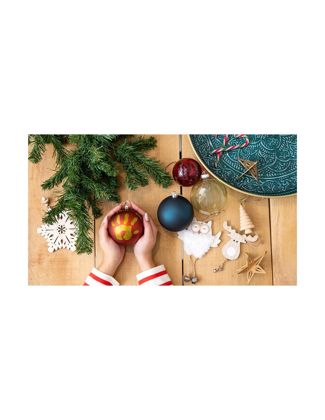 Crea un addobbo per l'albero di Natale con l'impronta della mano o del piede del tuo bambino per conservare un ricordo prezioso dei primi Natali trascorsi insieme.