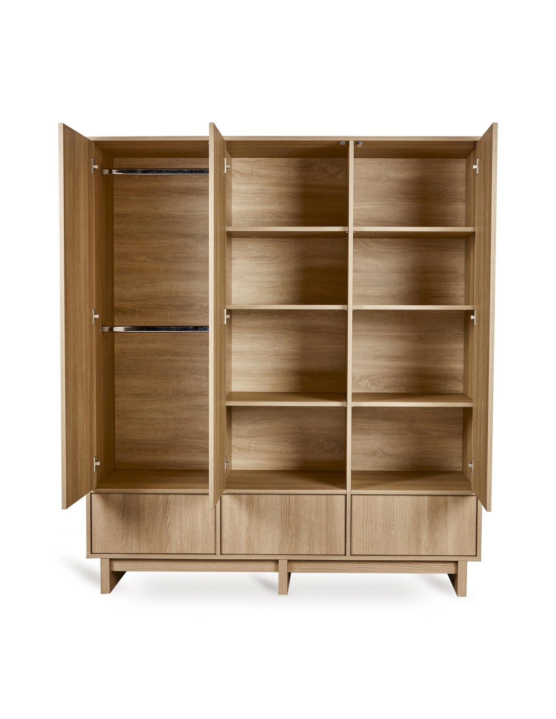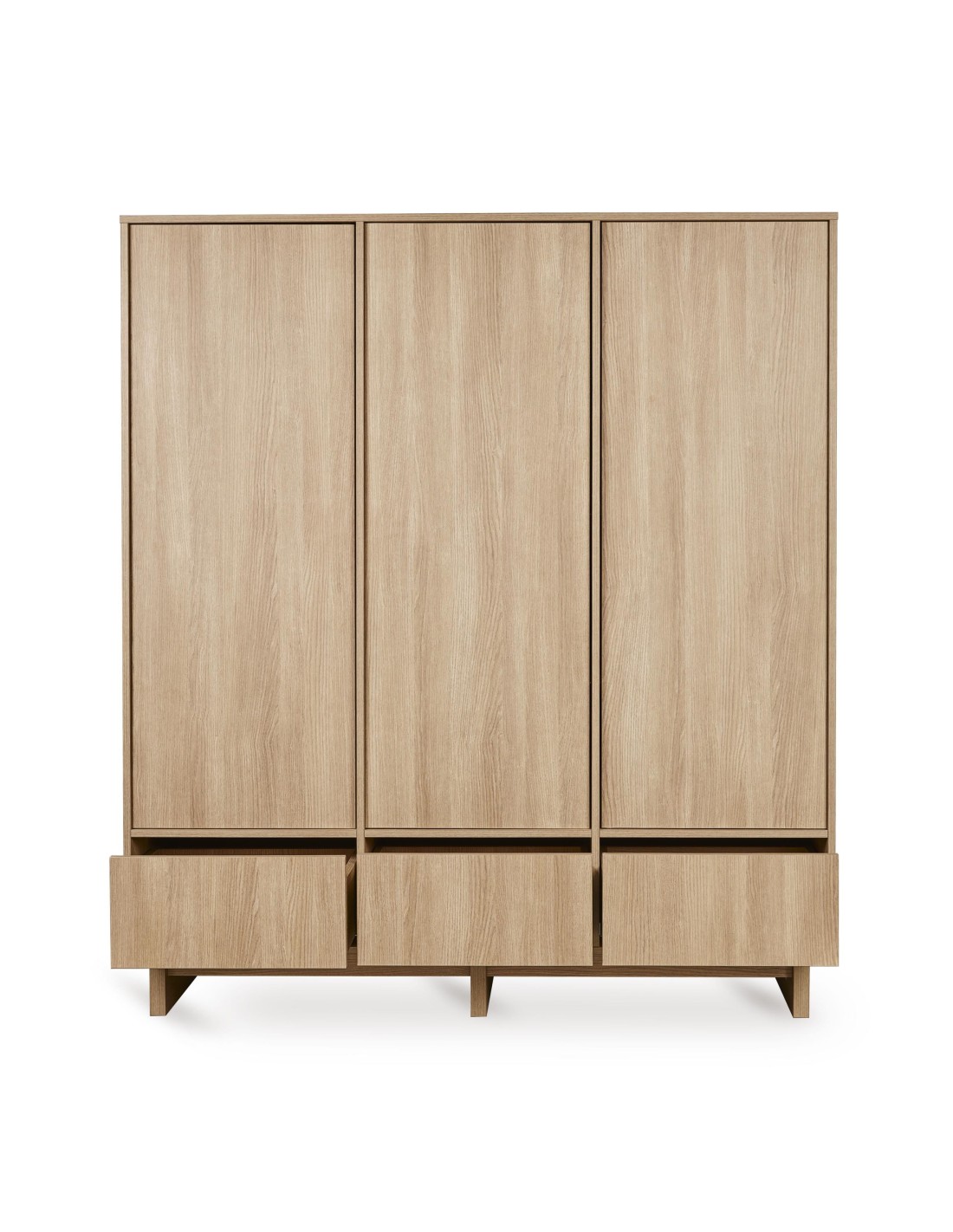 All'interno, sei ripiani regolabili e due aste per appendere i vestiti consentono una configurazione flessibile su misura per le vostre esigenze. Nella parte inferiore, tre ampi cassetti offrono spazio aggiuntivo per vestiti, biancheria o oggetti di uso quotidiano.