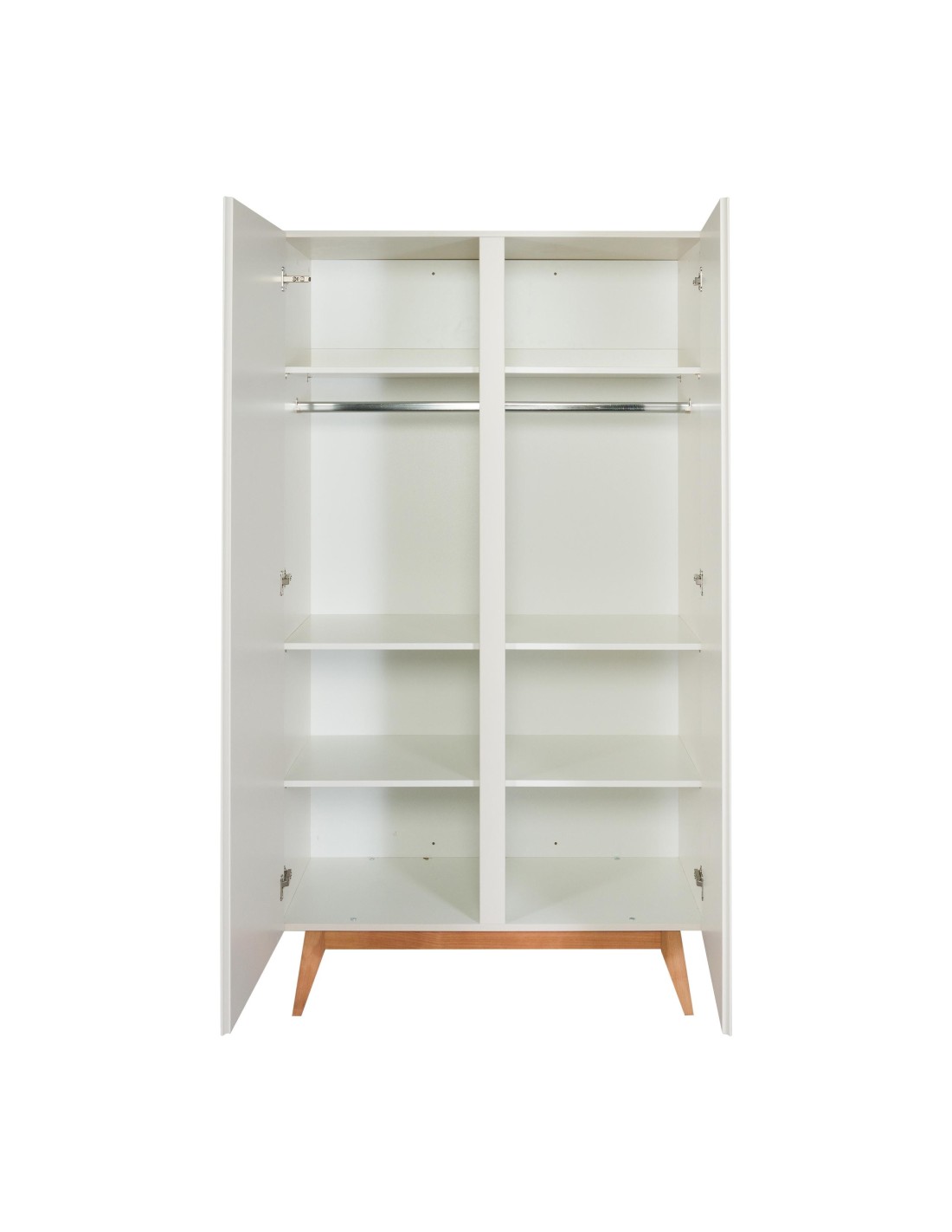 Questo armadio a due ante, dotato di tre ripiani e di un'elegante barra appendiabiti, non è solo un semplice mobile: è un'espressione poetica di stile e funzionalità.
