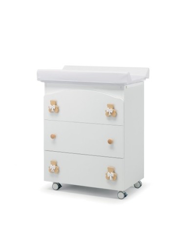 Il bagnetto fasciatoio Dudù è dotato di tre spaziosi cassetti, un comodo piano fasciatoio e una vaschetta ergonomica all'interno, garantendo così una maggior comodità e tranquillità per le fasi di cambio del bebè. É dotato di quattro ruote piroettanti con superficie in gomma antitraccia, di cui due con freno. Il prodotto è realizzato in truciolare di prima qualità, classe E1 a bassa emissione di formaldeide, con maniglie in legno massello di faggio.