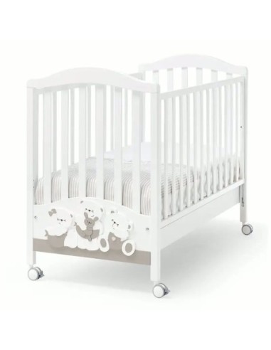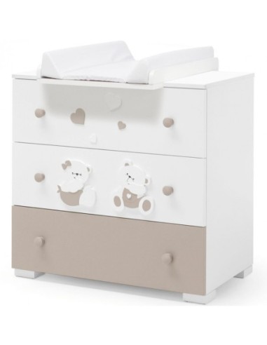 Il comò è composto da una solida struttura in legno con 3 ampi cassetti, ogni cassetto è dotato di due pomelli, inoltre è dotato di una prolunga e di un comodo fasciatoio per il cambio del bambino.