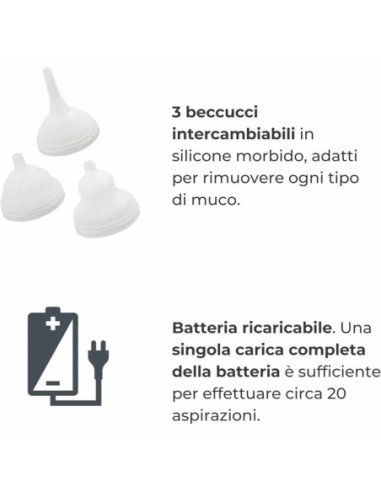 L’aspiratore nasale elettrico di Nuvita funziona con batteria ricaricabile ed è possibile effettuare circa 20 aspirazioni con una singola carica completa.