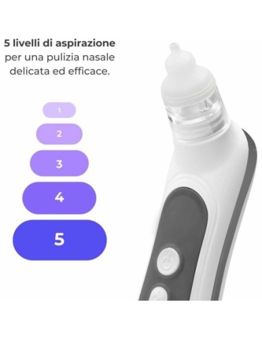 Dotato di 5 livelli di intensità di aspirazione l’aspiratore nasale elettrico per neonati e bambini permette di regolare la potenza in base alle alle specifiche esigenze: dal semplice raffreddore alla congestione più ostinata senza creare fastidio e senza irritare le mucose.