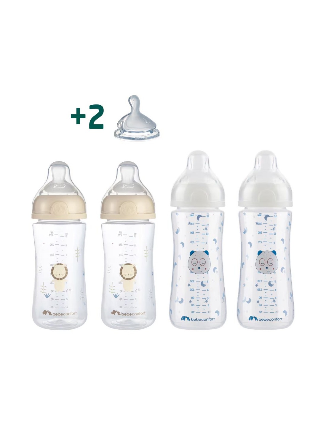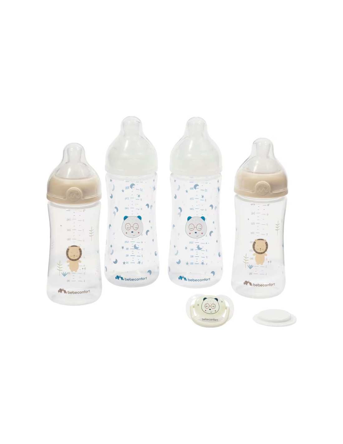 Con due biberon da 270 ml, due biberon da 360 ml e tre tettarelle di grandezza diversa, disporrai di tutto il necessario, dal primo giorno e per ogni fase dell'allattamento.
