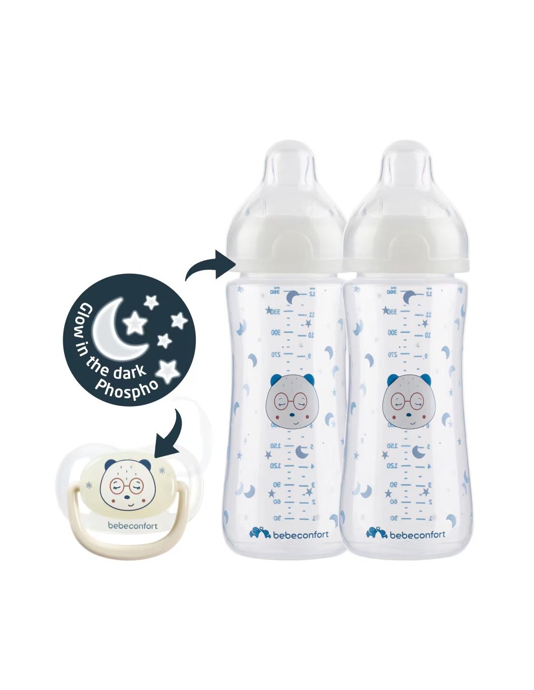 La ghiera fosforescente sui biberon agevola l'allattamento notturno e ti guida anche in condizioni di scarsa illuminazione. Il succhietto è fosforescente e risulta quindi facile da trovare al buio.