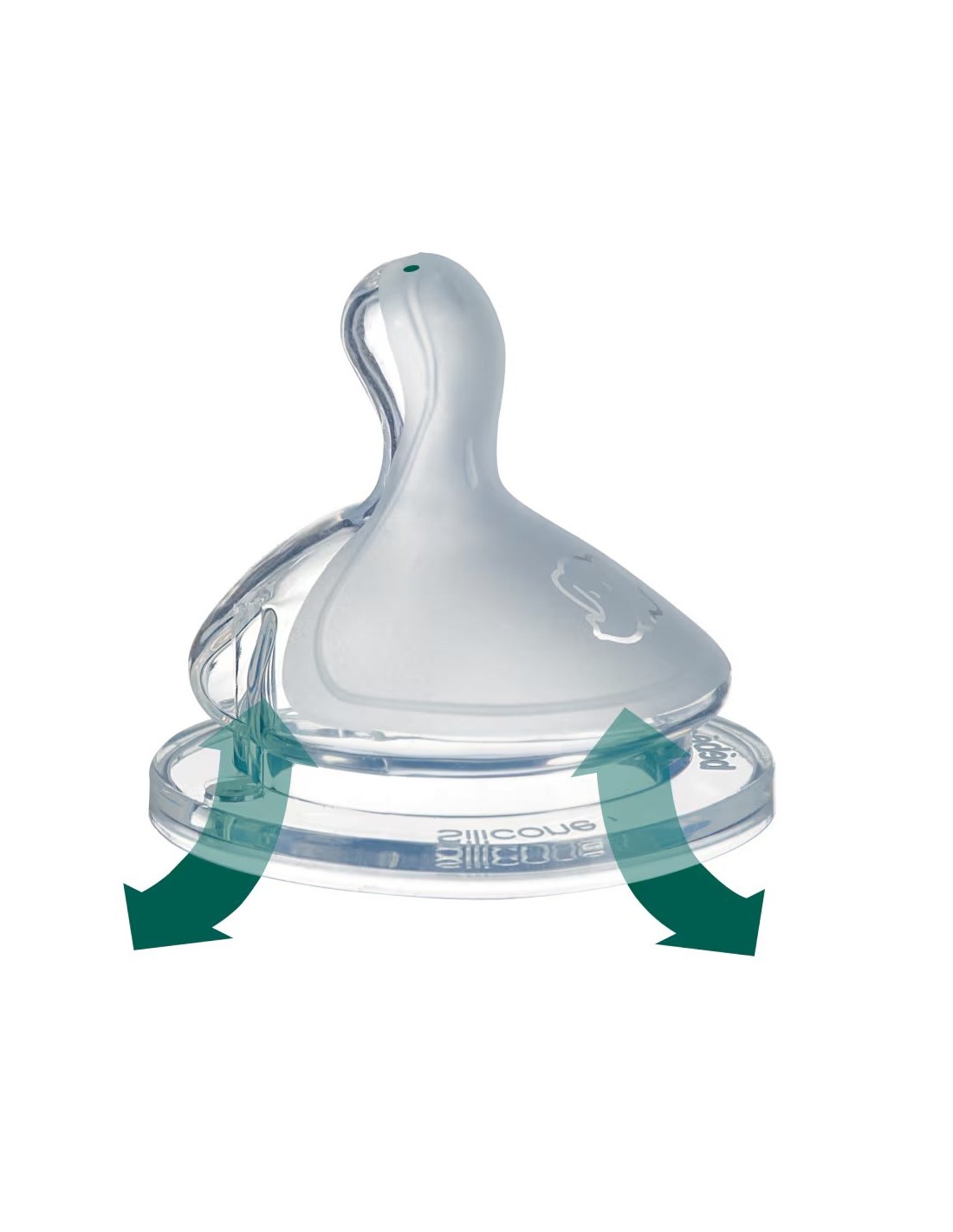 Ogni tettarella è dotata di un foro tagliato al laser per garantire un flusso ideale, adatto alle esigenze del neonato dalla nascita fino a quando non avrà più bisogno del biberon. La forma ergonomica dei biberon permette una presa agevole, mentre il sistema a doppia valvola anticolica aiuta a ridurre l'ingestione di aria e il rischio di coliche.