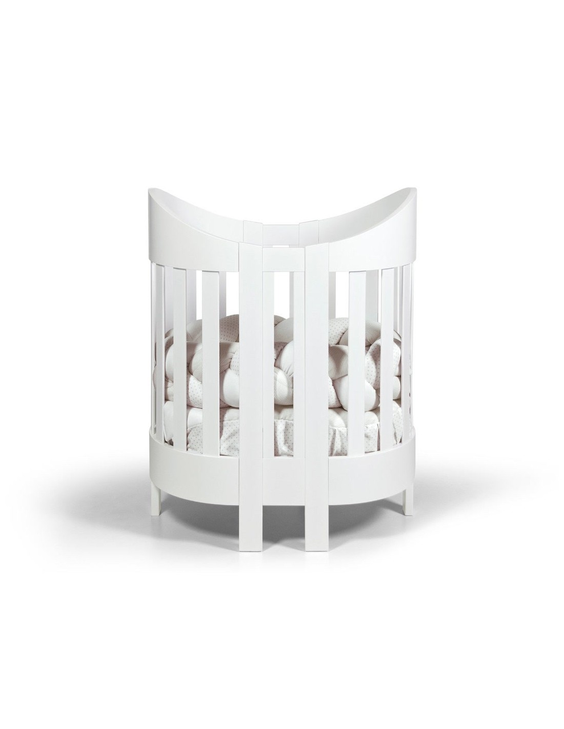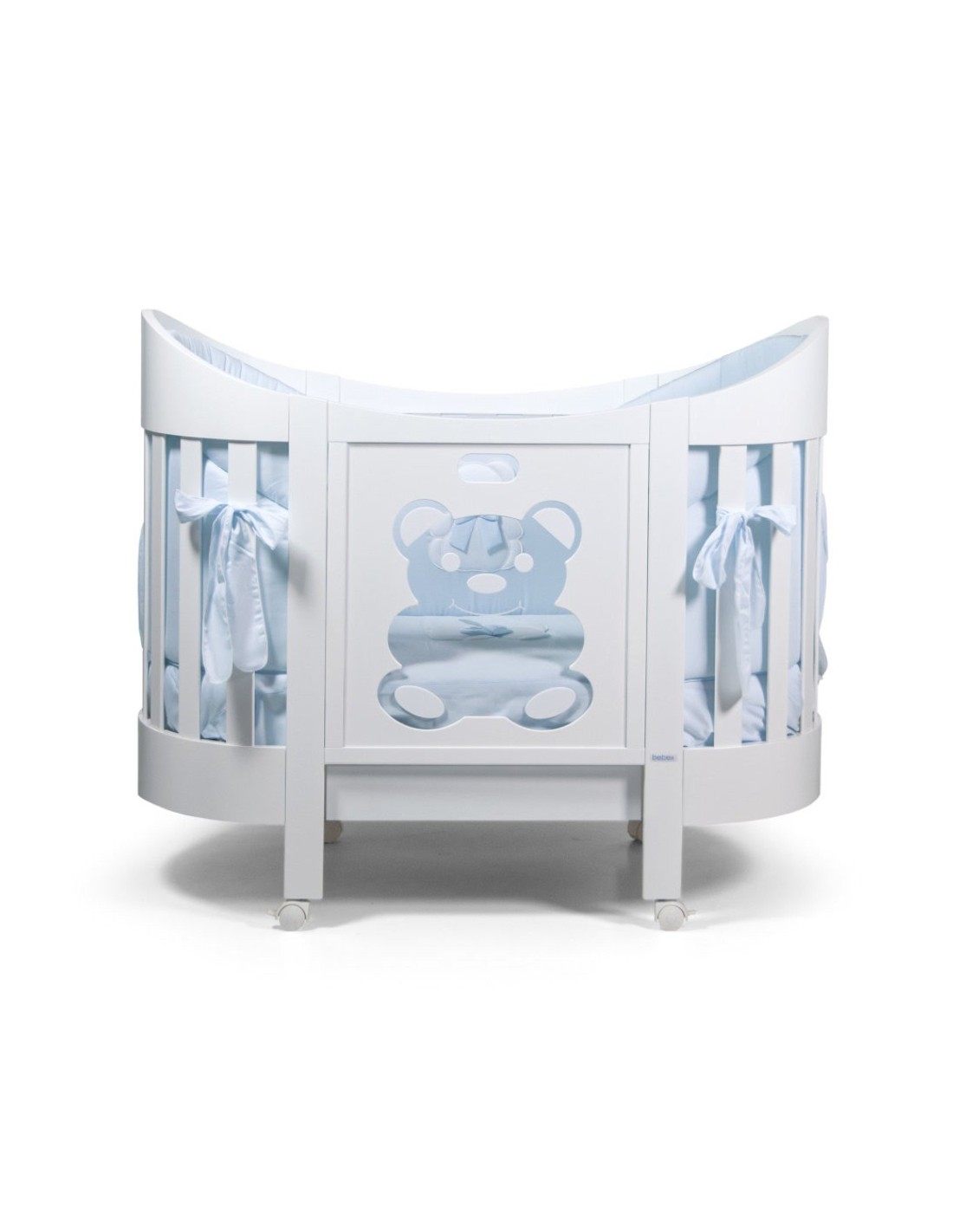 Lettino ovale del tipo “evolutivo”, che può essere montato in versione “mini” (vedi misure a margine) o in lettino di misura standard, grazie all’aggiunta di due spondine laterali in dotazione.