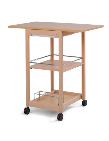 E' realizzato in legno massiccio di faggio verniciato e ha ruote gommate antigraffio, piroettanti e frenanti.
