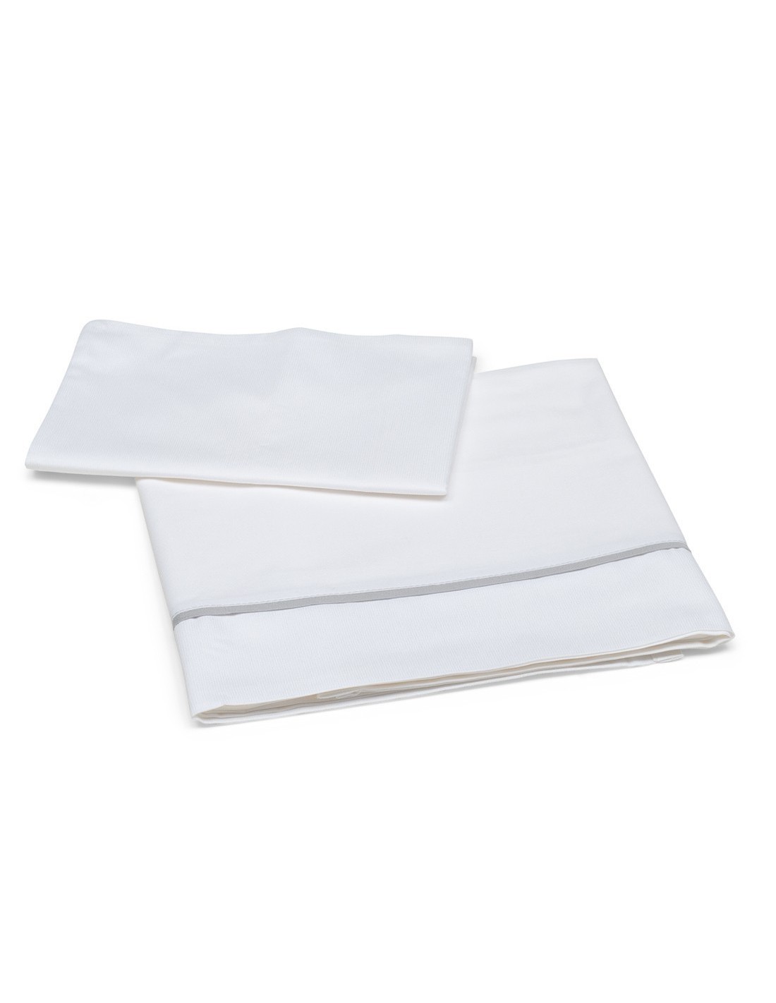 Il completo lenzuolino per co-sleeping evolutivo iCrib è caratterizzato da ricami classici nelle tinte del grigio.