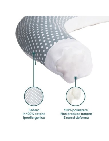 Comodo, avvolgente, e con la federa in 100% morbido cotone, ti aiuterà a dormire bene, a sostenere il peso del pancione e ad alleviare i dolori alla schiena da seduta e da sdraiata