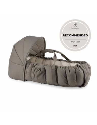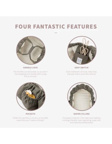 Il nido si adatta a carrozzine e passeggini e può quindi sostituire la tradizionale navicella. Quando i lati sono ripiegati, funziona come un grande e morbido tappeto da gioco dove il bambino può anche essere cambiato in caso di necessità.