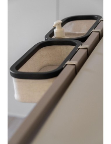 In opzione, sono disponibili cestini su misura in cotone e bambù (cod. 65MMxx), perfetti per riporre tutto in modo ordinato. I cestini sospesi offrono uno spazio di lavoro super pratico e ampliato.