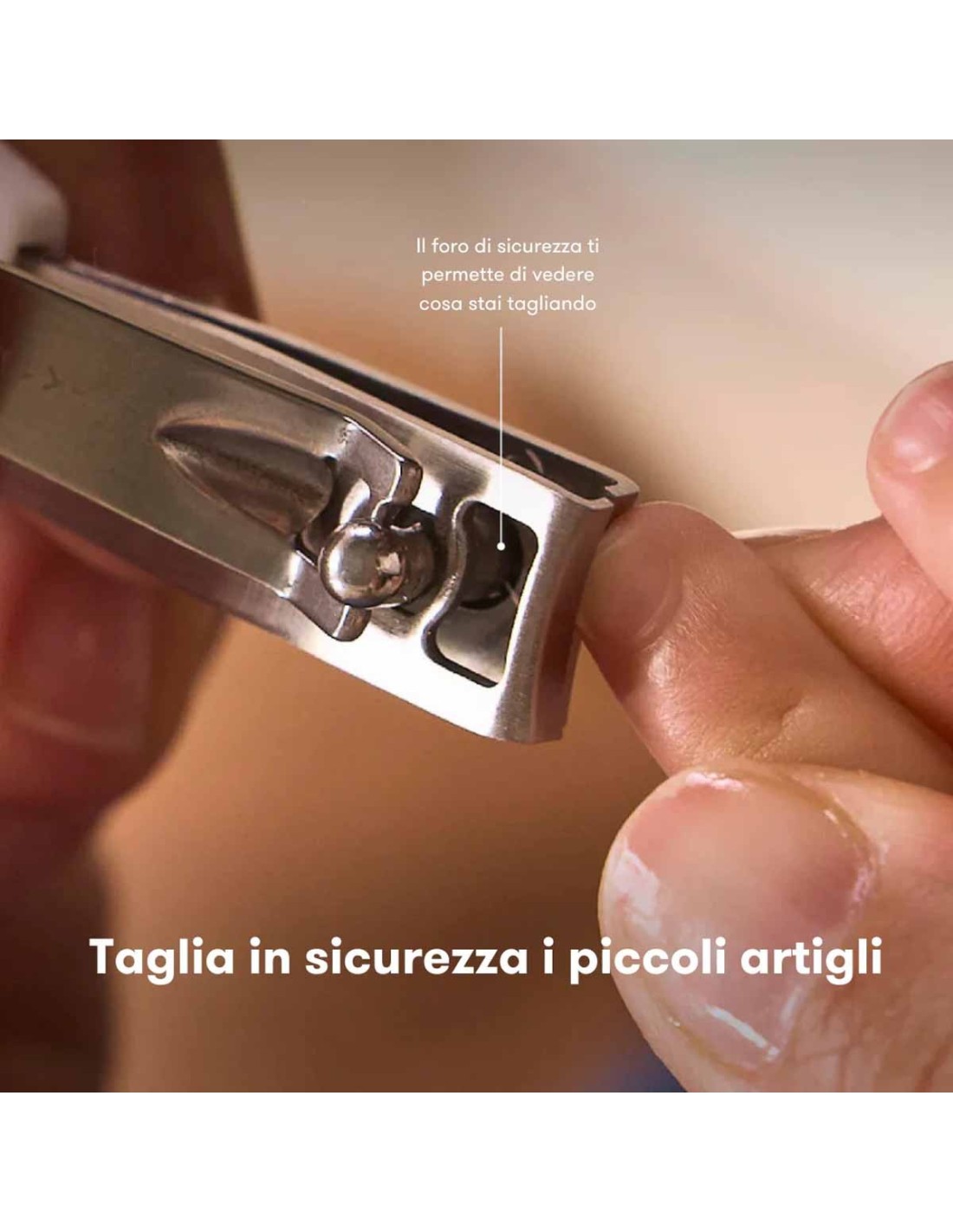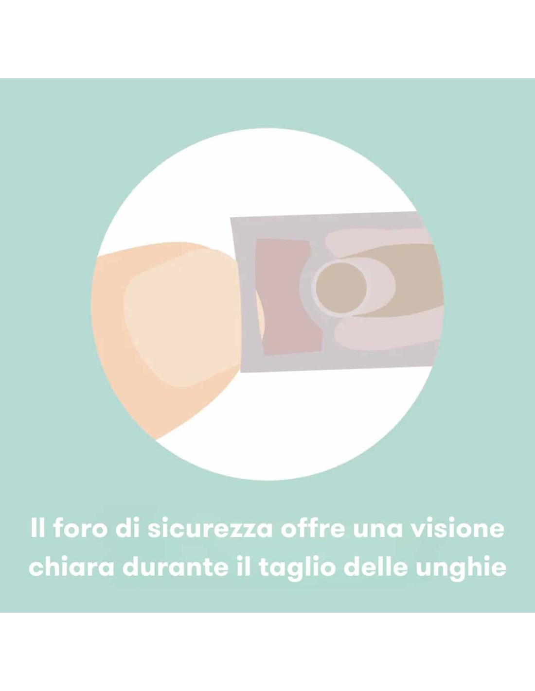 Massima sicurezza: il foro brevettato permette di vedere durante il taglio delle unghie, evitando così di danneggiare la pelle sensibile del bambino