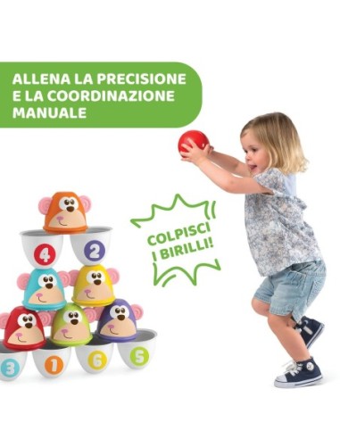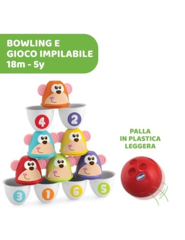 SET BOWLING: divertiti a fare strike con il bowling per bambini Chicco; lancia la pallina e colpisci i 6 divertenti birilli colorati e decorati con musi di scimmiette