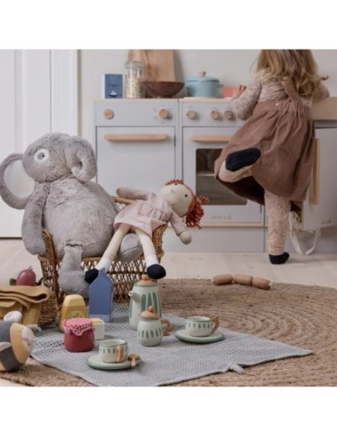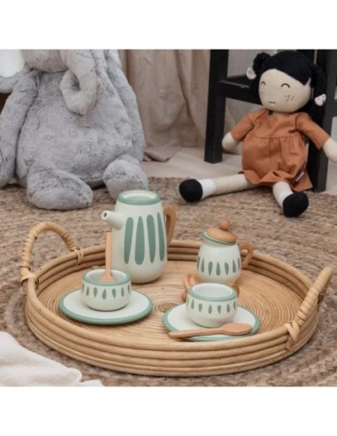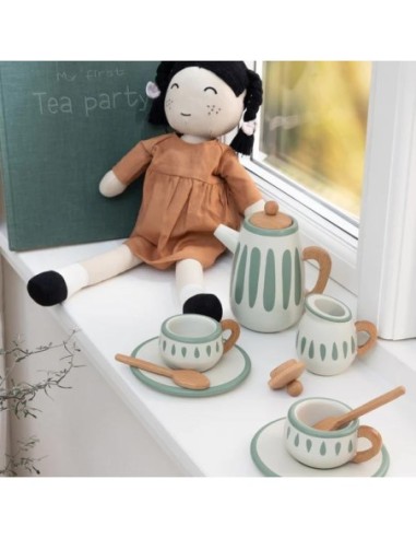 Il set è realizzato in legno certificato ed è composto da nove pezzi coordinati, tra cui una teiera con coperchio, una lattiera, una zuccheriera con coperchio, due tazze e piattini da tè e due cucchiaini, tutti realizzati in legno di faggio e MDF e dipinti.