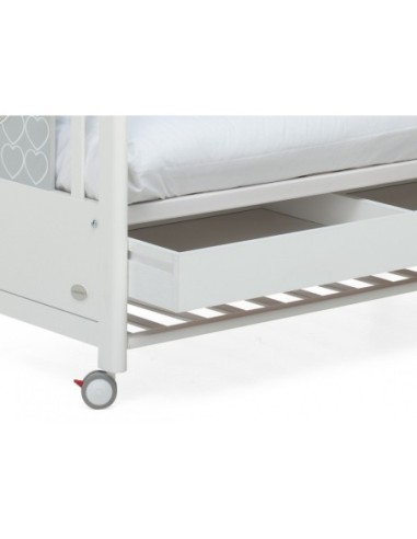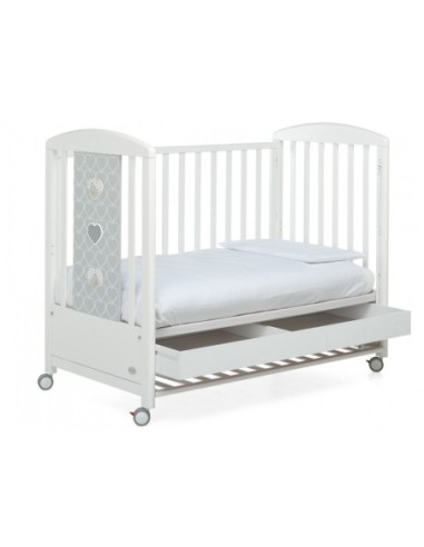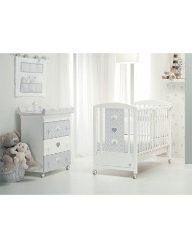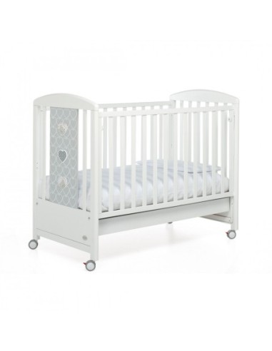 Anche la rete è regolabile a due altezze, per consentire un pratico uso anche quando il bimbo è neonato. E' caratterizzato da forme arrotondate che esprimono un'eleganza senza tempo, con tonalità trendy all'insegna del bianco e del grigio. Una delle testate del lettino ha decorazioni con teneri cuori in rilievo che racchiudono un dolcissimo orsetto. Il lettino ha un ampio cassetto inferiore, suddiviso in due scomparti, e ruote gommate antigraffio, con sistema frenante, per facilitare gli spostamenti.