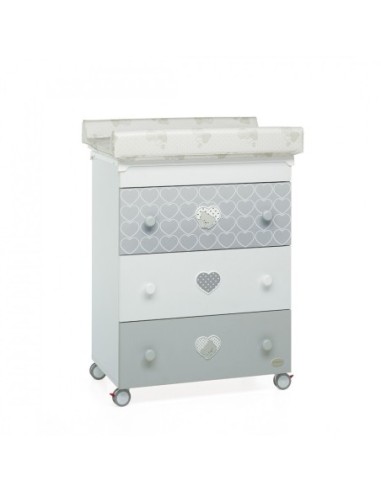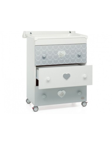 Caratterizzato da tonalità all’insegna del bianco e grigio, sui tre ampi cassetti ha decorazioni con teneri cuori che racchiudono un dolcissimo orsetto. Ha ruote gommate antigraffio, con sistema frenante, per facilitare gli spostamenti. La struttura solida e durevole nel tempo è 100% made in Italy!