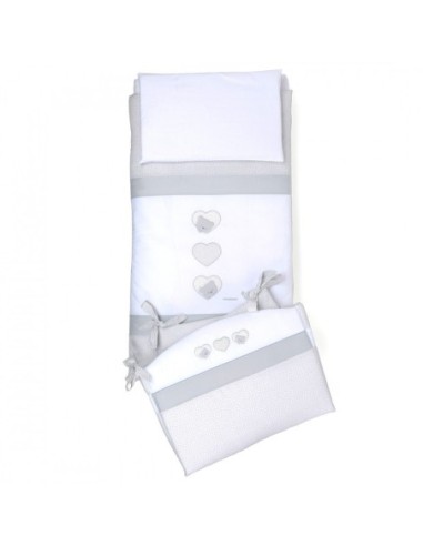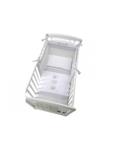 Il completo piumone Lovely di Foppapedretti è caratterizzato da raffinati ricami che richiamano gli orsetti e i cuori della cameretta. Il set tessile è composto da paracolpi con imbottitura in poliestere 100% e rivestimento in cotone 100%, sacco sfoderabile in cotone 100% e imbottitura in poliestere 100% e federa per cuscino in cotone 100%.