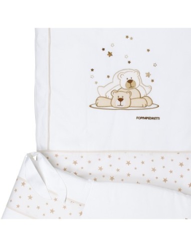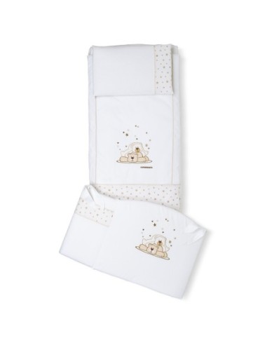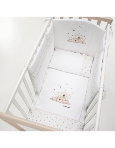 Il completo piumone Pikkoletto Dolcestella bianco di Foppapedretti è caratterizzato da ricami con due teneri orsetti e tante stelline, nelle tinte del grigio. Il set tessile è composto da paracolpi con imbottitura in poliestere 100% e rivestimento in cotone 100%, sacco sfoderabile in cotone 100% e imbottitura in poliestere 100% e federa per cuscino in cotone 100%.