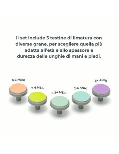 Il set include 5 testine di limatura con diverse grane, grazie a cui è possibile personalizzare il trattamento non solo in base all’età del bambino, ma anche allo spessore e alla durezza delle unghie di mani e piedi.