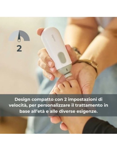 Il taglia unghie neonato elettrico Trimmy è dotato di due impostazioni di velocità, grazie alle quali è possibile adattare l'operazione di limatura delle unghie a seconda dell’età del bebè: