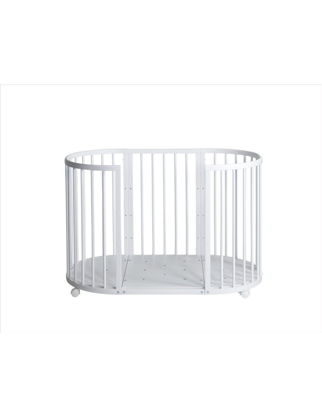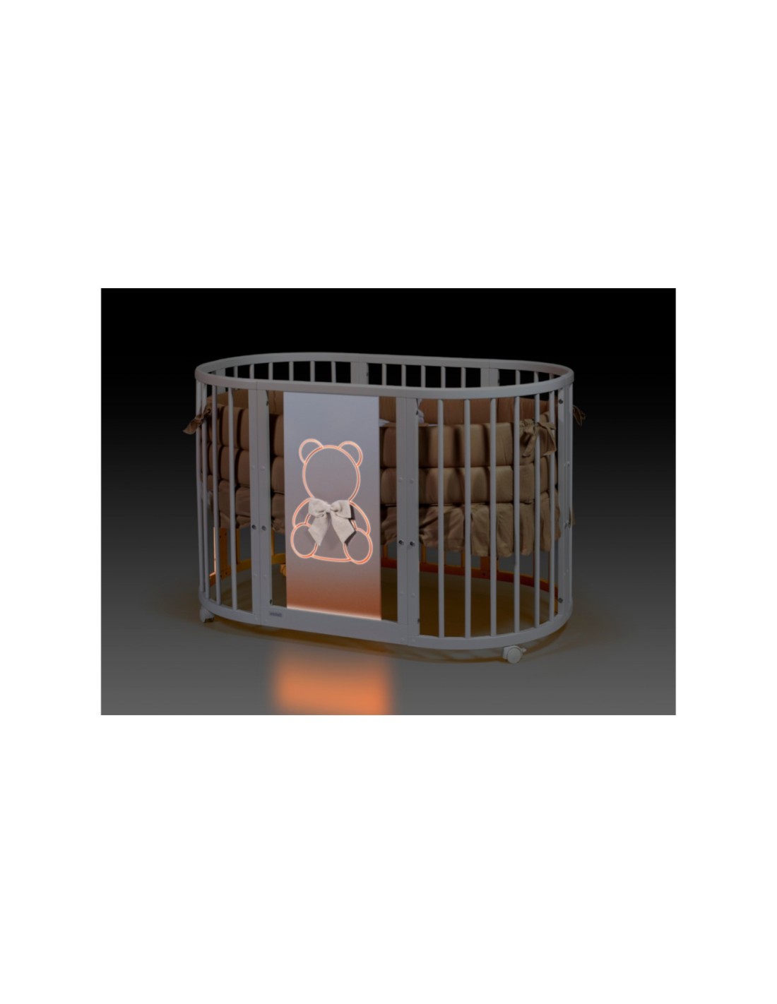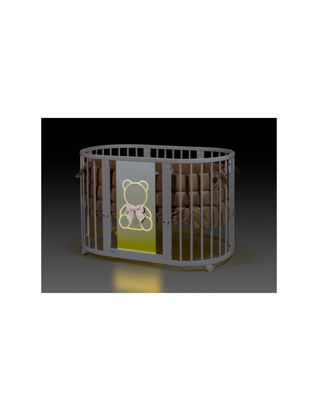 Può essere poi trasformato in lettino ovale, di misura standard, con l’aggiunta di due pannelli laterali in dotazione, di cui uno luminoso. Inoltre, può essere utilizzato come box, lettino montessoriano o comode poltroncine.