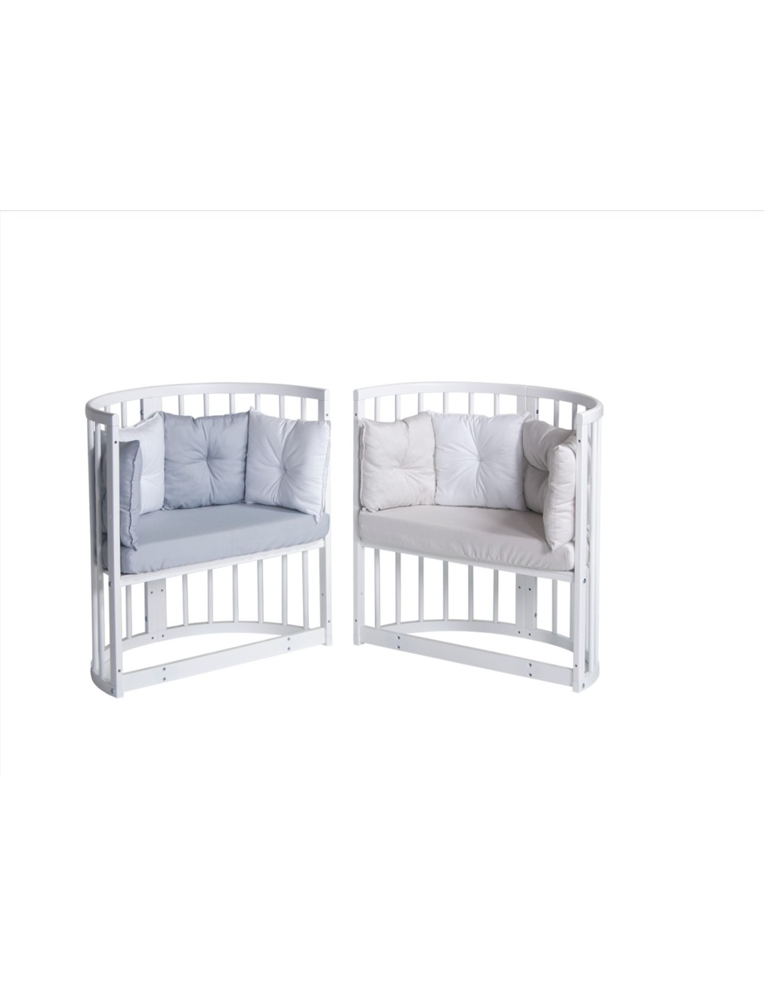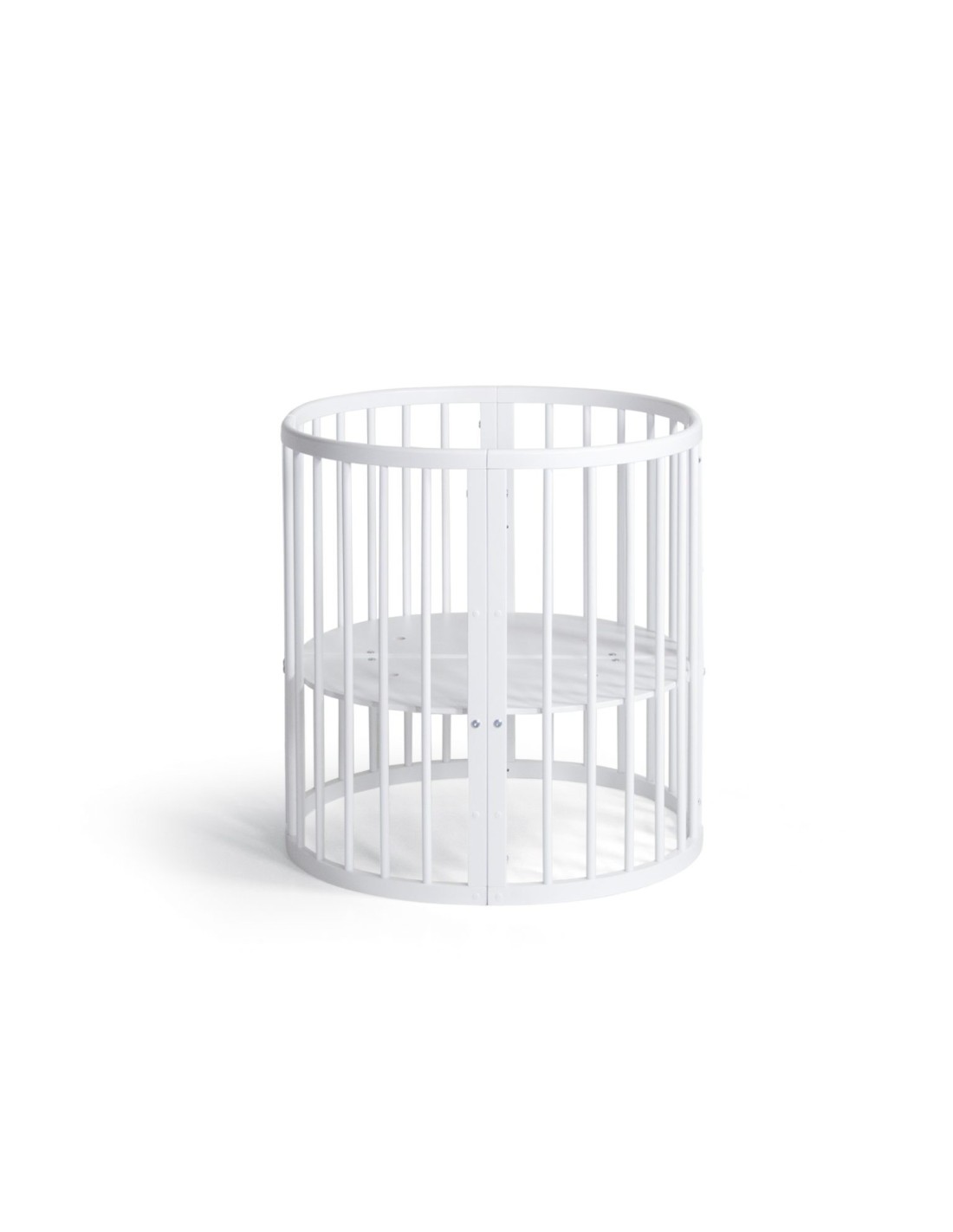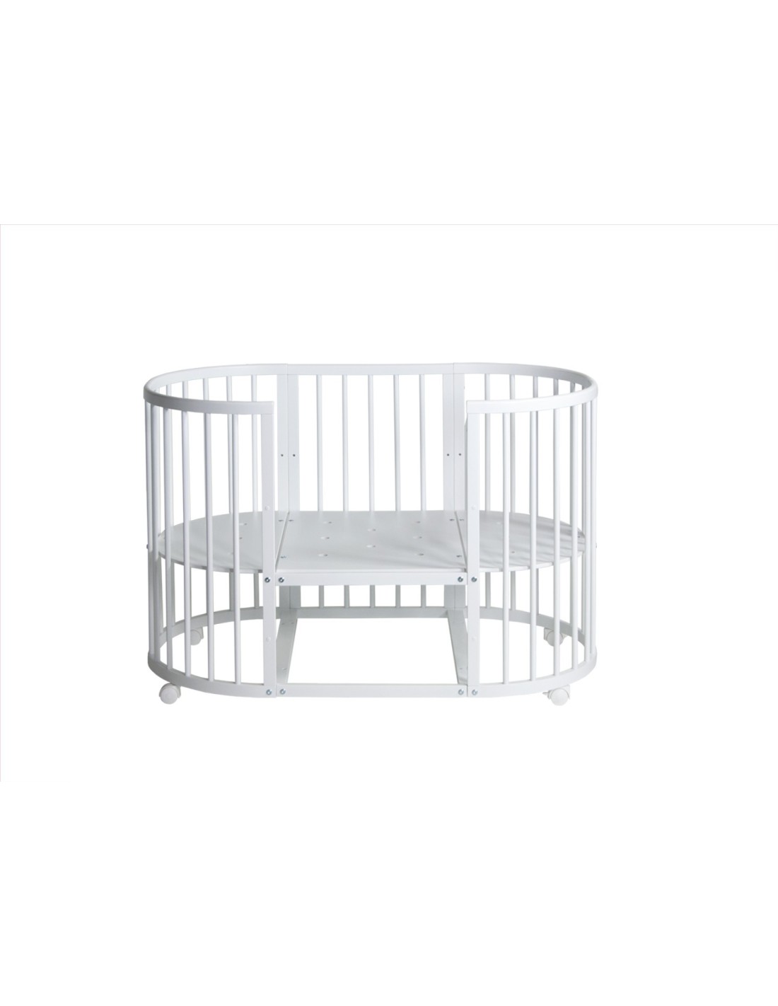 Lettino evolutivo che può essere montato come culla tonda “mini”, per un utilizzo durante i primi mesi di vita del bambino. Può essere poi trasformato in lettino ovale, di misura standard, con l’aggiunta di due pannelli laterali in dotazione, ed inoltre, può essere utilizzato come box, lettino montessoriano o comode poltroncine.