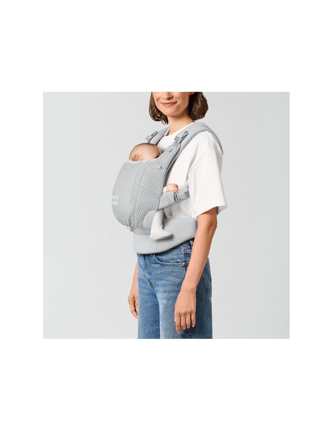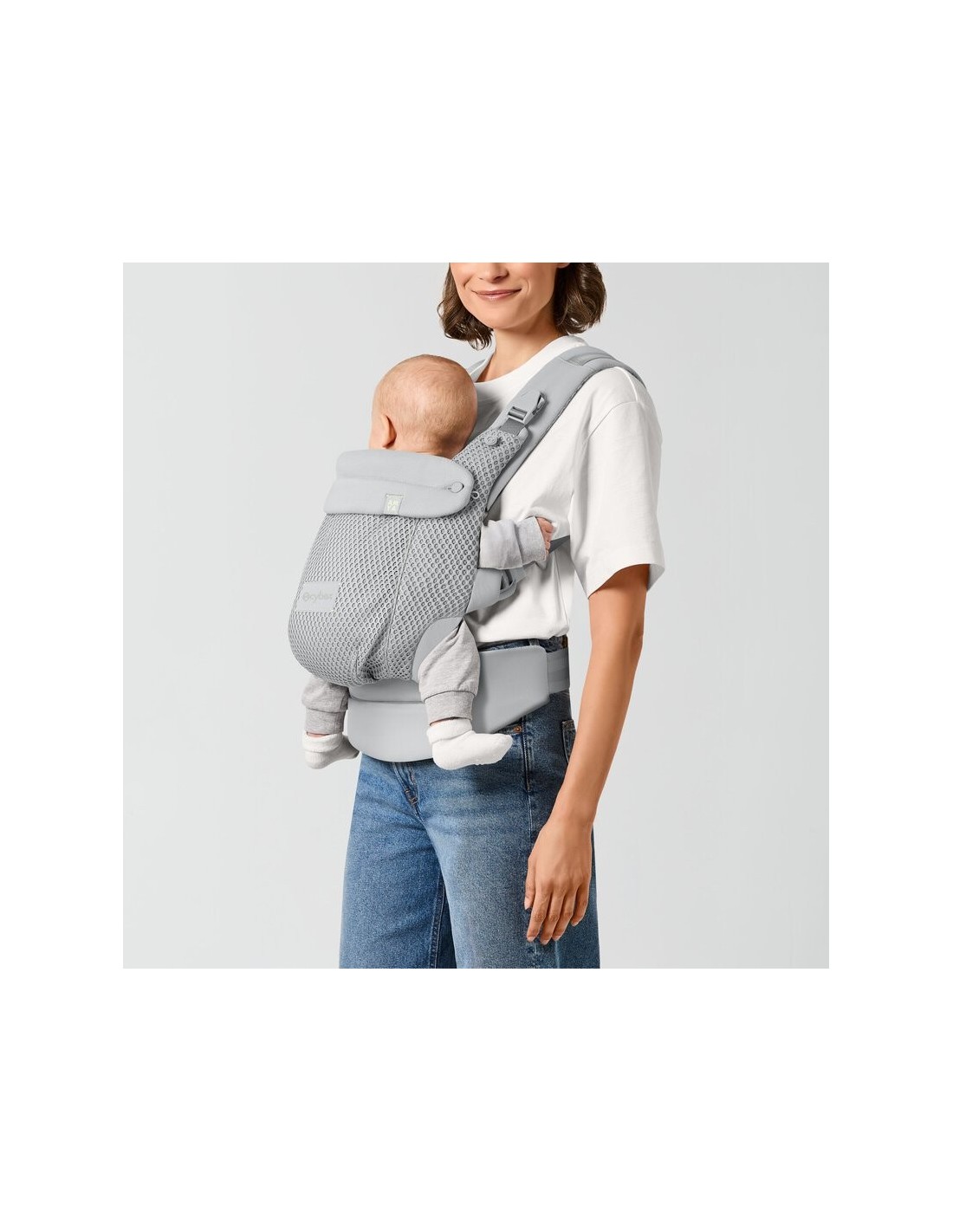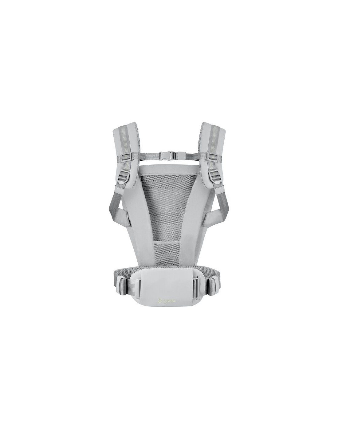 Nelle calde giornate estive, tieni il tuo bambino vicino con il tessuto in rete 3D traspirante che riveste il pannello posteriore, la cintura in vita e le bretelle e offre comodità e freschezza. Immagine del CYBEX Gold Amya Baby Carrier che mette in risalto la caratteristica Supporto ergonomico.