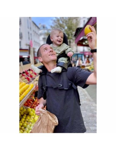 Il comfort per il genitore viene fornito posizionando il bambino su una seduta appositamente progettata, sospesa appena sopra le spalle, alleviando così collo e spalle dallo stress diretto. Per passeggiate più lunghe in tutta comodità.