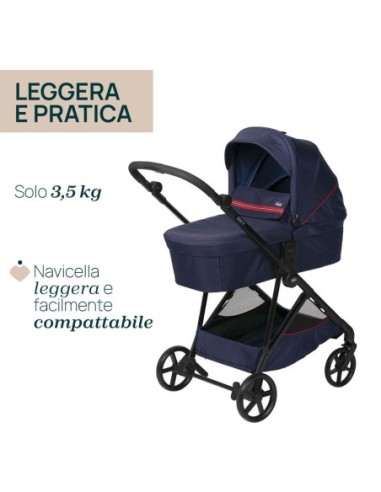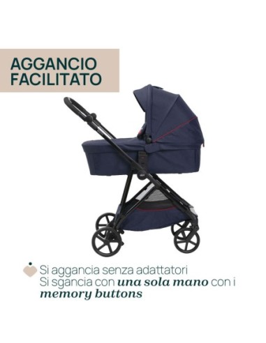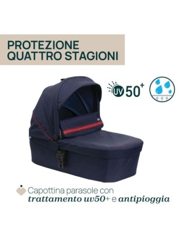 L'ampia cappottina garantisce protezione dai raggi UV50+ e dalla pioggia. I pulsanti memory permettono di sganciare la navicella dal telaio con una sola mano.