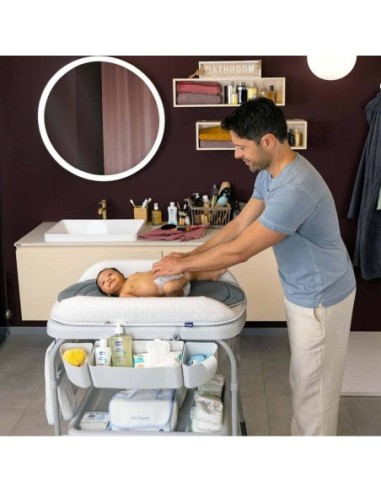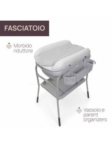 Super pratico grazie al vassoio e agli scomparti portaoggetti dove potrai riporre tutto il necessario per il cambio e il bagnetto.