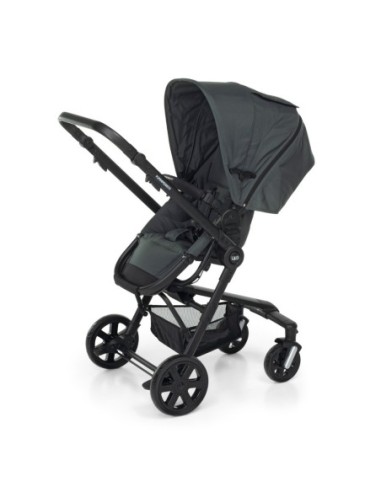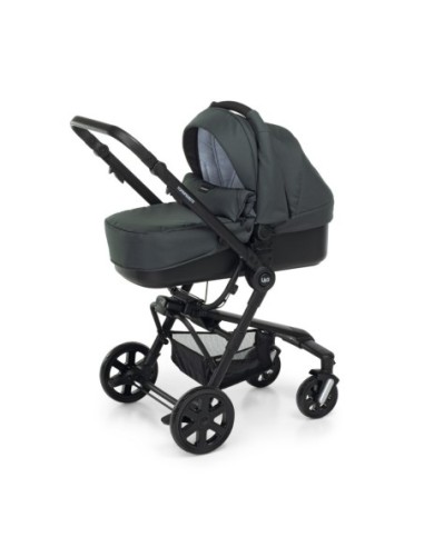 Sul telaio in alluminio si possono montare, in modo pratico e veloce: la navicella in versione carrozzina con maniglione di trasporto, il nuovo ovetto omologato i-Size che ha la funzione di seggiolino auto per i primi mesi, la seduta del passeggino reversibile fronte strada o fronte mamma