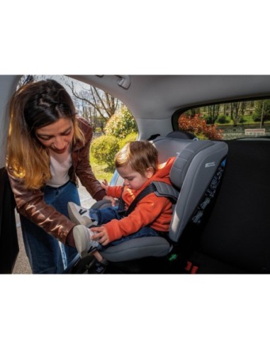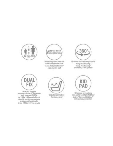 Seggiolino auto i-Size per bambini da 40 a 150 cm. Seduta girevole a 360°. Utilizzabile solo su veicoli predisposti di aggancio ISOFIX + TopTether per utilizzo da 40-105 cm, possibilità di installazione “dual fix” con e senza sistema ISOFIX per utilizzo da 100 -150 cm