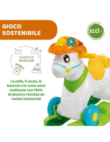 Sviluppa la capacità di movimento e la creatività Corpo e sellino, base a dondolo, ruote sono realizzati per l'80% di plastica riciclata, nel pieno rispetto dell'ambiente e rispettando gli alti standard qualitativi e di sicurezza di tutti i giocattoli Chicco.