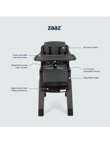 Essendo più compatto della maggior parte degli altri seggioloni, ZAAZ è in grado di adattarsi meglio all'altezza del tavolo. E dal momento che il cibo è per i bambini quello che i colori erano per Picasso, ci siamo assicurati che sia anche super facile da pulire.