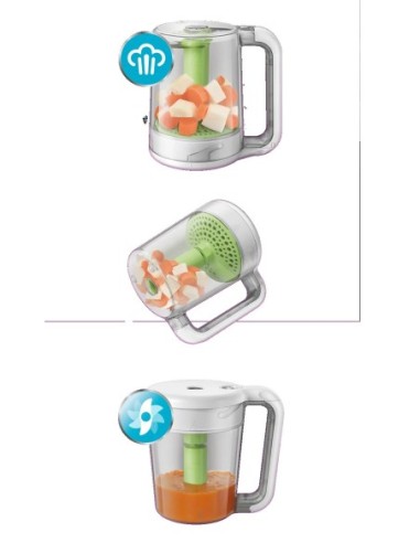 Non è necessario aspettare o restare a guardare. Un segnale acustico avvisa quando il cibo è cotto. Non dovrai fare altro che capovolgere il recipiente, frullare e servire la pappa o conservarla per il prossimo utilizzo.