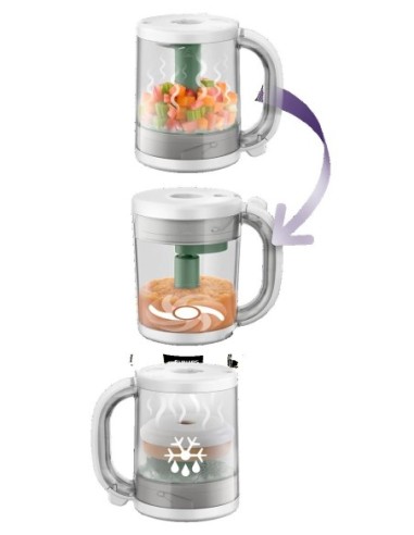 Avrai a disposizione tutto il necessario per preparare pappe nutrienti in un unico recipiente. Una volta che gli ingredienti sono cotti al vapore, tutto quello che devi fare è sollevare il recipiente, capovolgerlo e bloccarlo in posizione, in modo da frullare il contenuto fino alla consistenza desiderata.