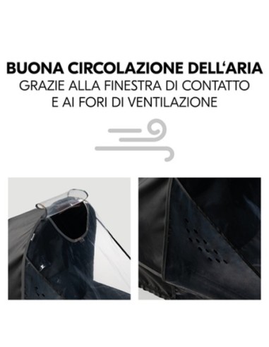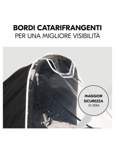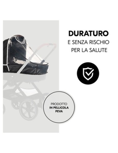 Grazie al cordoncino, il parapioggia si adatta facilmente e in modo ottimale alla navicella. Un'ulteriore chiusura a strappo fissa la copertura ai lati e il bimbo rimane sempre asciutto. La copertura antipioggia, robusta e durevole, è realizzata in pellicola PEVA, innocua per la salute.