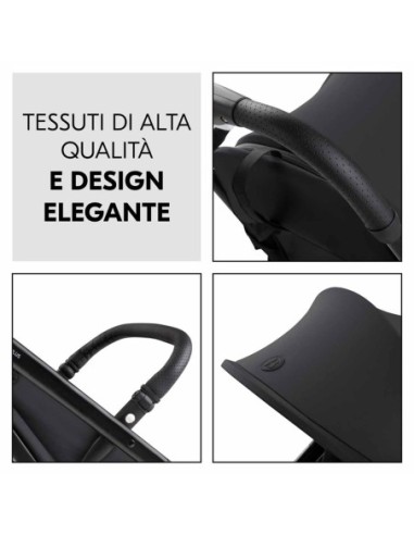 La barra di protezione e il manubrio sono in similpelle traforata, mentre la seduta e la cappottina sono in tessuto stretch.