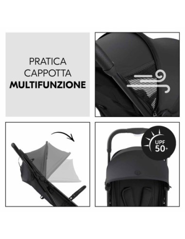 La cappottina parasole con UPF 50+ lui offre una piacevole ombra e le aperture laterali in tessuto a rete offrono una buona circolazione dell’aria.
