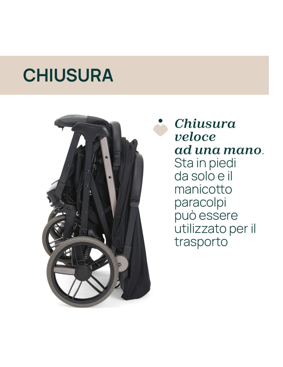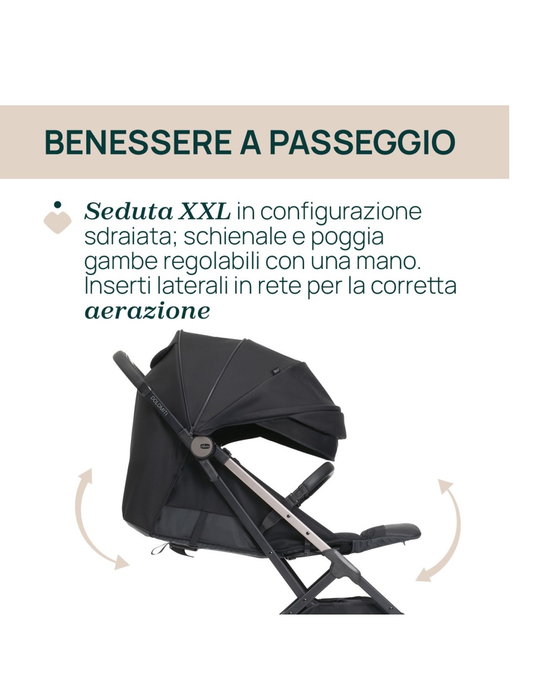 La fibbia magnetica permette di allacciare le cinture in modo rapido e sicuro, mentre la capottina extra large, super accessoriata, offre protezione UV50+ ed è dotata di trattamento idrorepellente per affrontare ogni uscita in totale tranquillità.