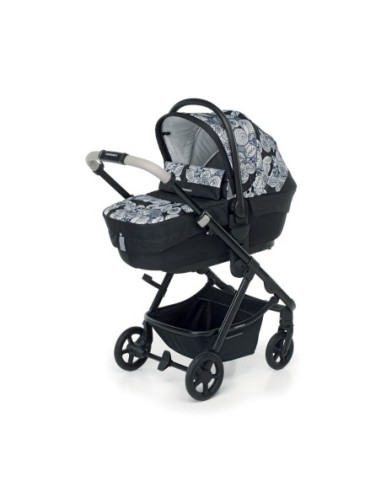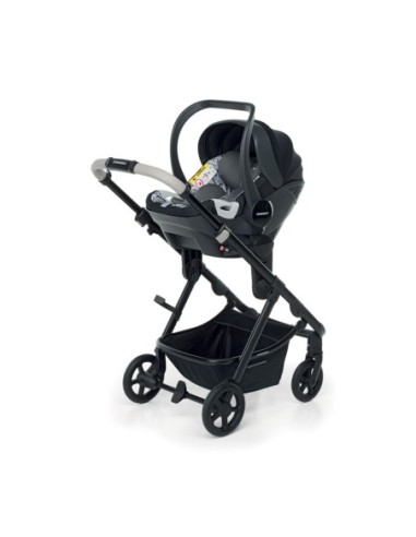 Sistema trio combinato composto da: passeggino EUREKA, adatto dalla nascita fino a 22 kg, con seduta reversibile e capottina regolabile in altezza, navicella CLASSIC rigida, seggiolino auto Next i-Size per bambini da 40 a 80 cm, borsa mamma a doppio fondo rigido con tasca termica e materassino per il cambio.