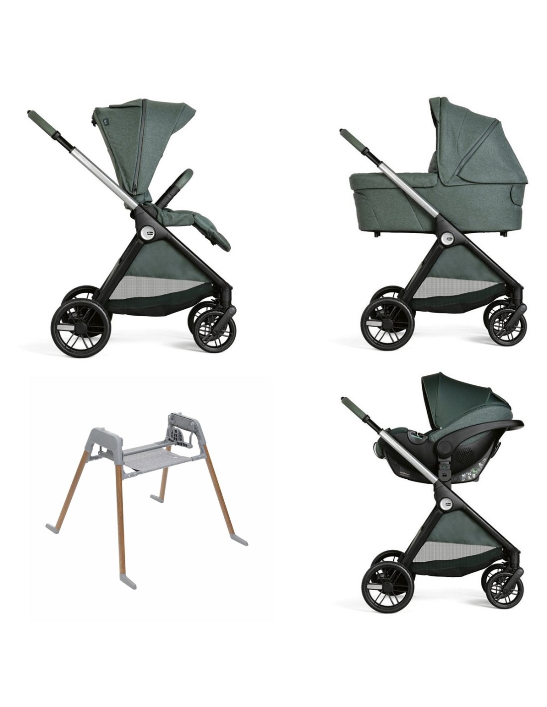 Omologato dalla nascita fino a 22 kg (4 anni) include il passeggino, la culla Flexi, il seggiolino auto Kory Plus e gli adattatori