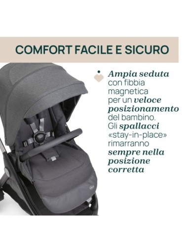 Ti consente di gestire tutto senza sforzo con un solo gesto, garantendo lamassima funzionalità e permettendo ai genitori di avere una mano libera o di tenere il bambino in braccio.