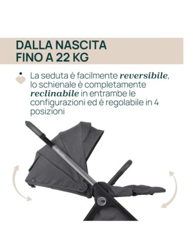 Omologato dalla nascita fino a 22 kg. La seduta è facilmente reversibile, lo schienale si reclina in entrambe le configurazioni ed è regolabile in 4 diverse posizioni con una sola mano.
