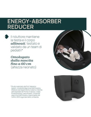 Lo speciale cuscino Energy Absorber Reducer garantisce ai neonati una maggiore sicurezza e comfort per tutti i viaggi. È omologato per l'uso da 40 a 60 cm.
