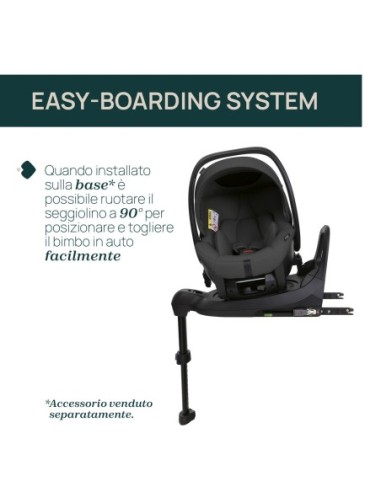 Sistema Easy-Boarding per un facile posizionamento del bambino grazie alla rotazione del seggiolino verso i genitori quando installato sulla "Base Full 360 i-Size" (venduta separatamente).