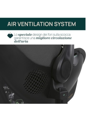 La corretta circolazione dell'aria durante i giorni caldi è garantita grazie agli inserti in rete sulla capotte e sulla base della navicella. Per le giornate invernali, il bambino è protetto grazie all'aletta antivento estraibile sulla copertina.